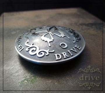 >会社概要 >ご利用案内 ブランド drive [ドライヴ] 品番 concho-03 品名 リバティーバタフライコンチョ 税込み価格 \19,440円 送料代引き手数料無料 幅 37mm 厚み 6mm 重量 約20g 素材 silver925 37mmの大きなコイン型コンチョ。 コインには蝶のモチーフに加え月と太陽をデザインしている。 蝶 ヒラヒラと舞い上がる様子から「向上心を忘れない」 太陽 「晴れの日」 月 「闇の日」 晴れの日も闇の日も向上心を忘れない。 というメッセージが完成する。 数量 数量 1 2 3
